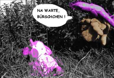 Das pinke Kaninchen ist leicht auszumachen zwischen lauter grünen Büschen und Bäumen.